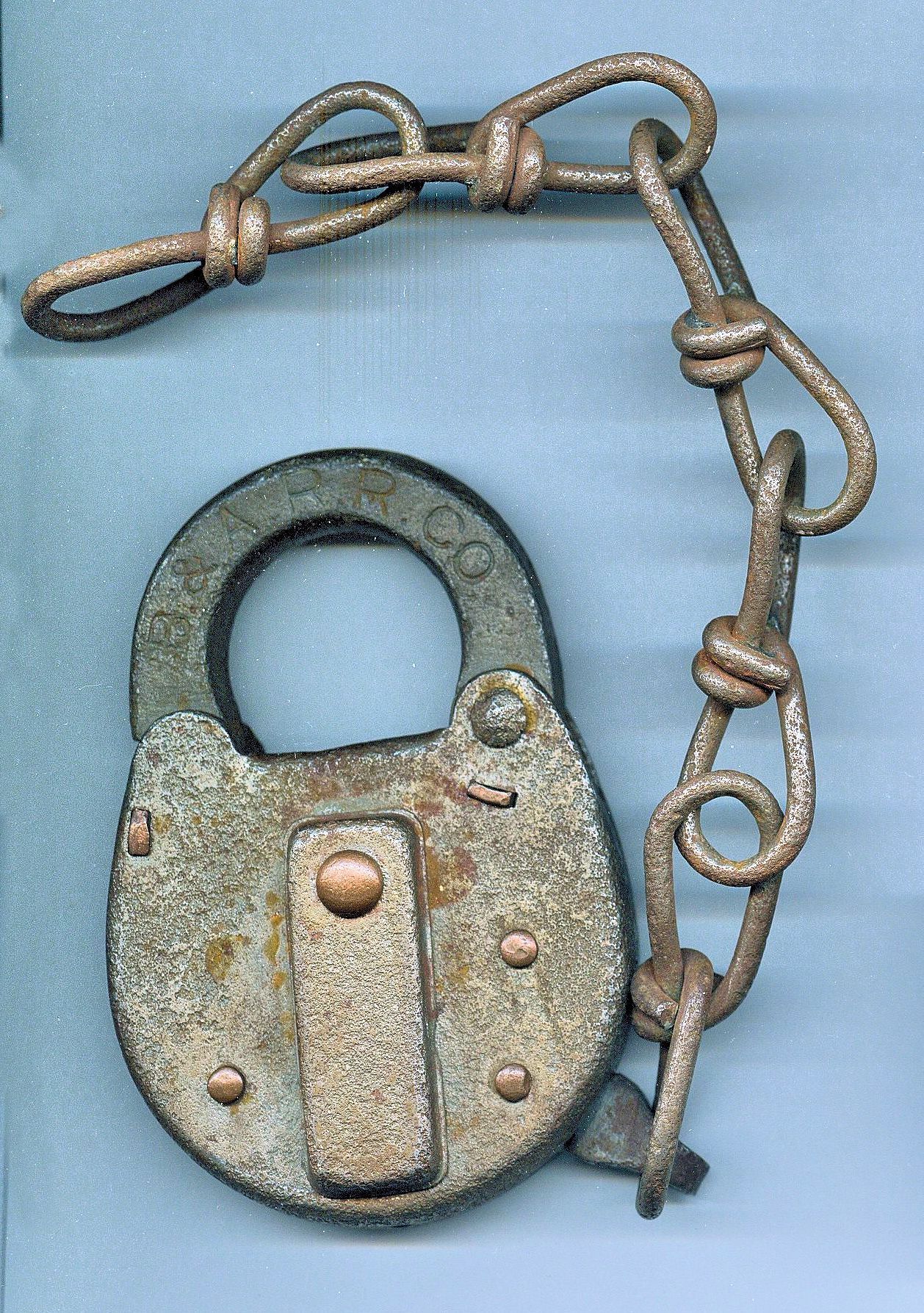 Baltimore & Ohio RR (LBO-101) - Standard steel Adlake stamped "B&O RR" on the back and numbered 79 on the hinge pin. Rusty shackle. Tested and works...$22 FRONT BACK