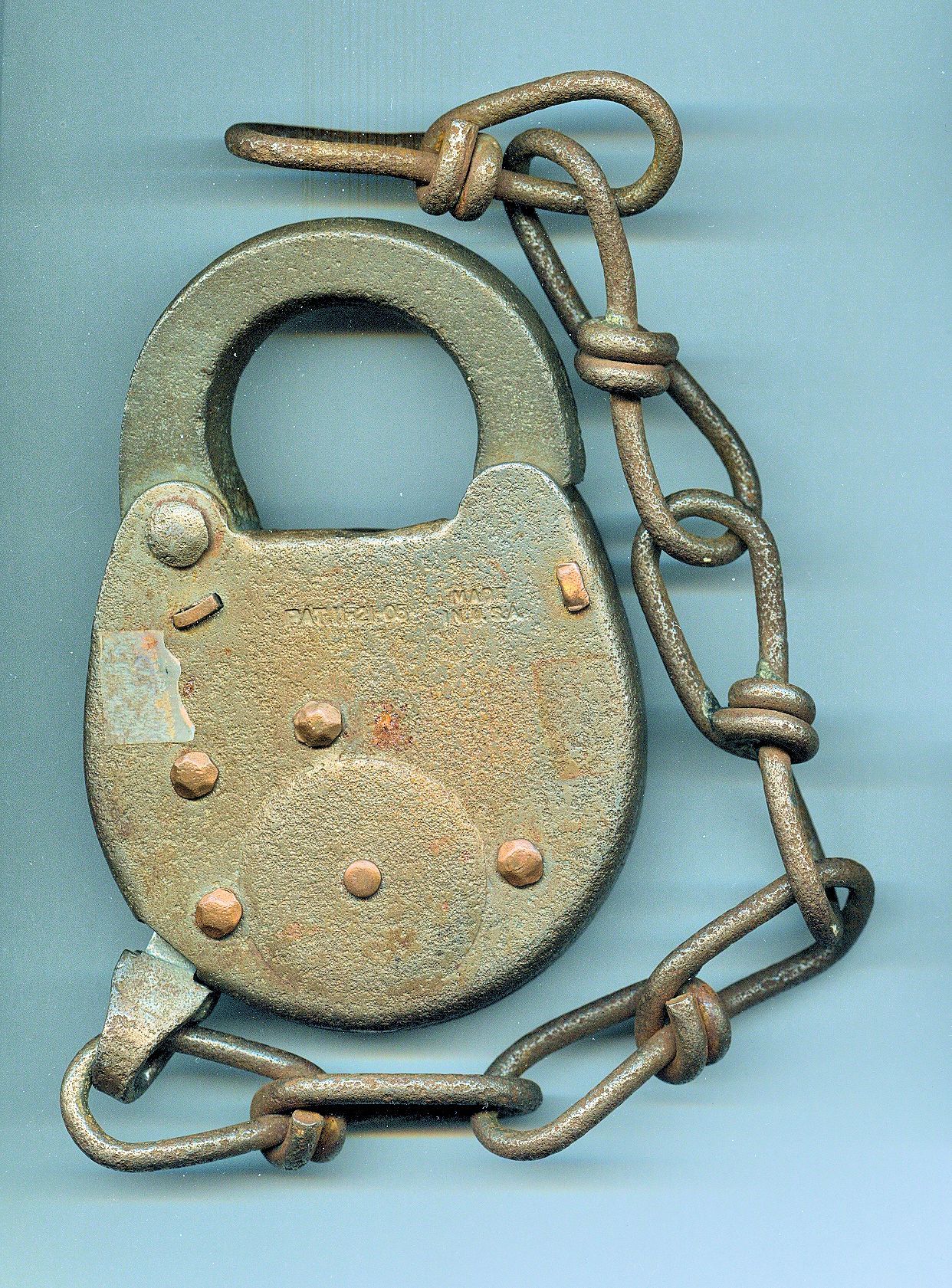 Grand Trunk Pacific - Brass lock with steel shackle. Stamped "GTP." Key drop nicely sprung but rivet has solder repair...$45 FRONT BACK