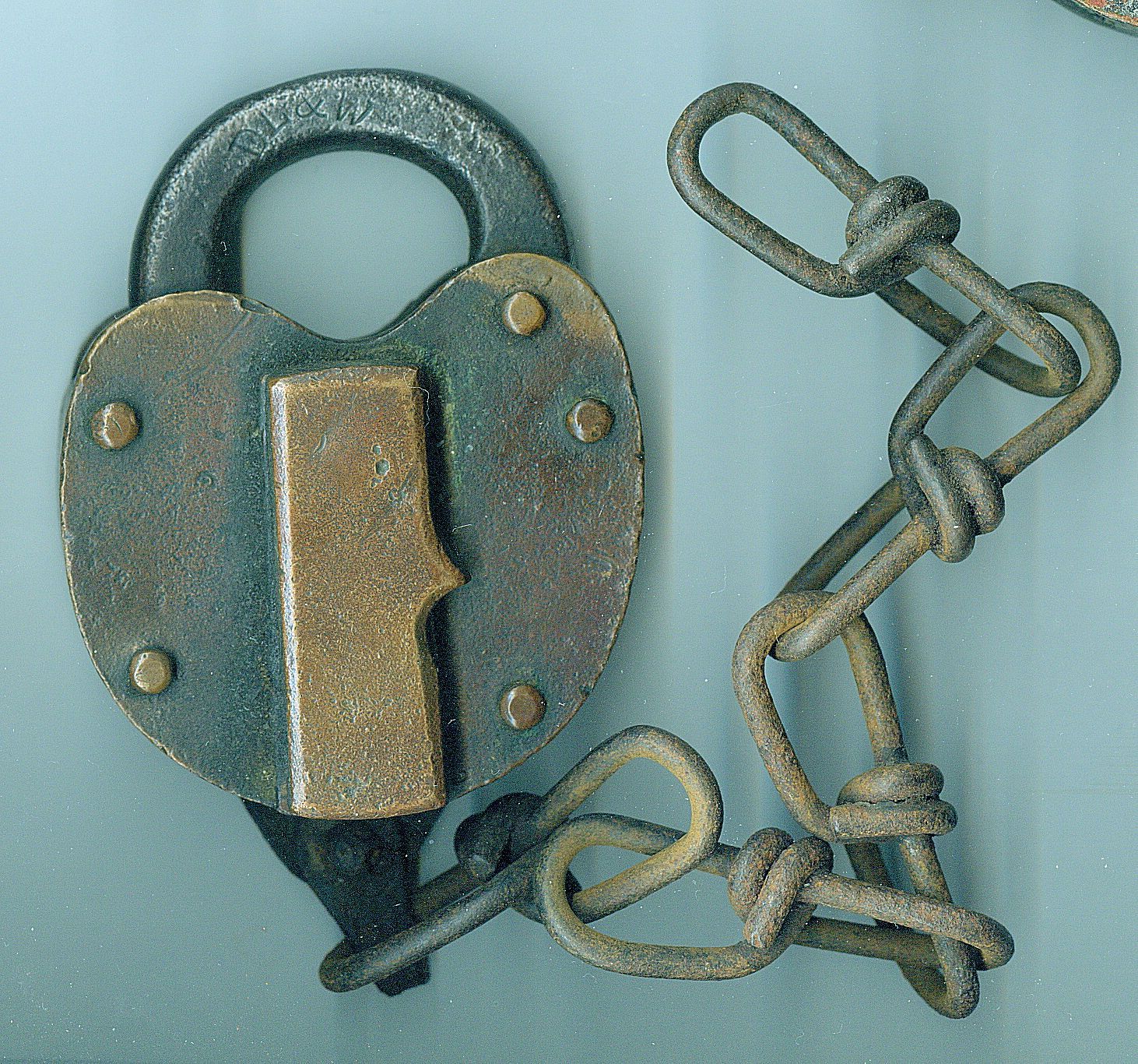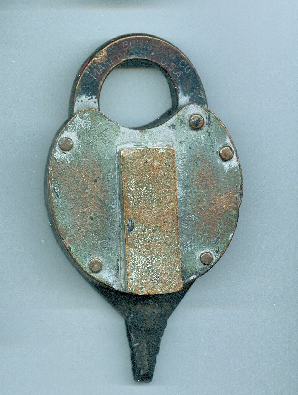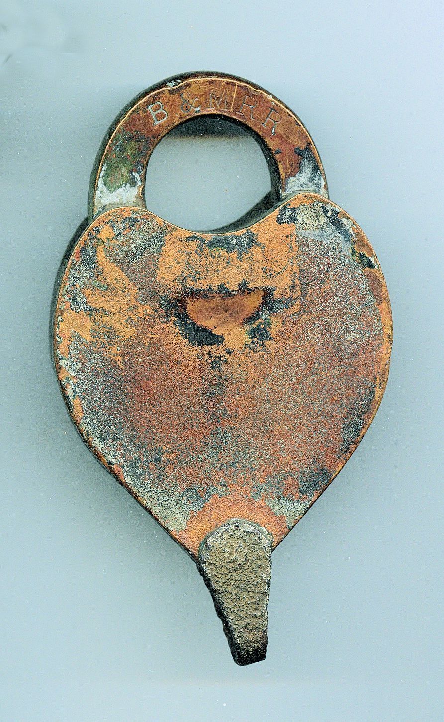 Chicago, Rock Island & Pacific RR - Heart-shaped brass lock by the Hansl Mfg. Co. Stamped CRI&P RR on the shackle. Nice shape!...$55 FRONT BACK
